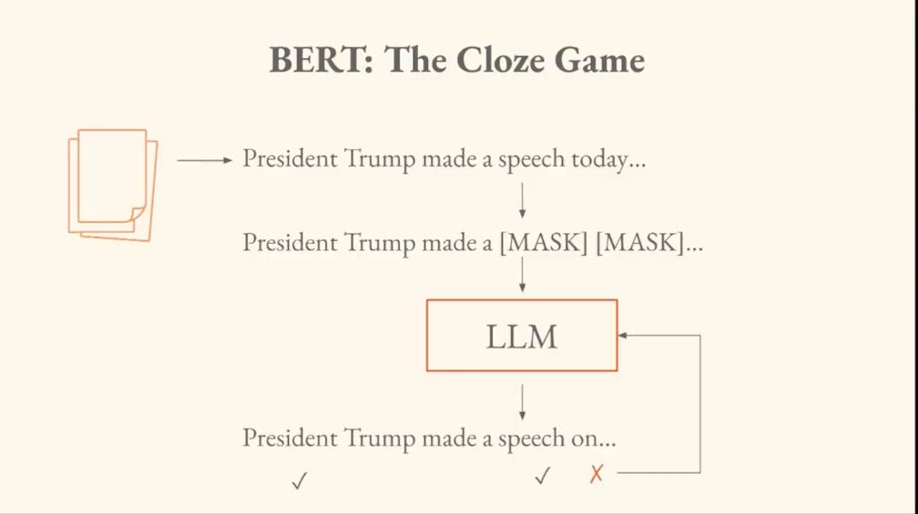 When discussing Wittgenstein’s Language Games (how the meaning of words and sentences is determined by their use in specific contexts or activities), he uses the example of BERT training with Cloze games. Trainers mask words in a sentence, get the model to guess the words, and then the model learns through this process.