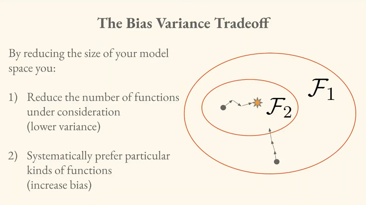A smaller model space gives you more stability, but it might be systematically wrong (bias). A larger model space gives you more expression but it’s sensitive to noise in your dataset (variance).
