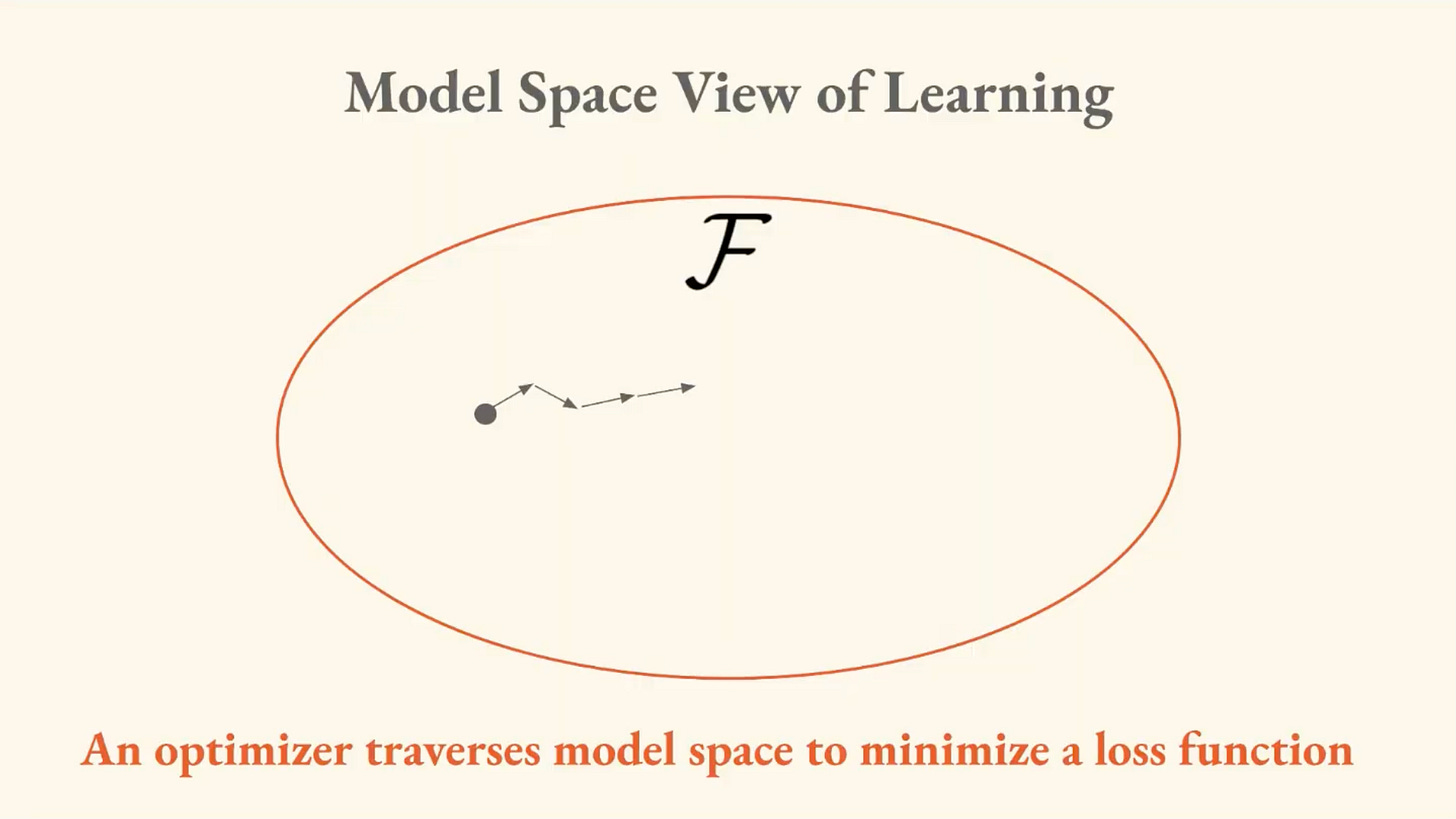 The model space is the set of all possible models that can be expressed by a given architecture and parameterization. For our neural network, this is the set of all possible functions that it can compute. The model space is formed by all possible configurations of parameters that can be put into the network.
